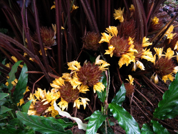 浪星竹芋(Calathea rufibarba Fenzl 'Wavestar')为肖竹芋属多年生草本观叶植物,也称波浪竹芋、浪心竹芋、剑叶竹芋。株高25厘米至50厘米,茂密丛生。叶基稍歪斜,叶片倒披针形或披针形,长15厘米至20厘米,叶面绿色,富有光泽,中脉黄绿色,叶缘及侧脉均有波浪状起伏,叶背、叶柄都为紫色。春天里的浪星竹芋不只用优美的叶片在谱写浪漫,还用花儿点亮春日。花序犹如从地面涌出,灿烂,奇美,明黄色的花朵着生于螺旋状的花萼中,显得明亮而艳丽,远望像点燃蜡烛的蛋糕。