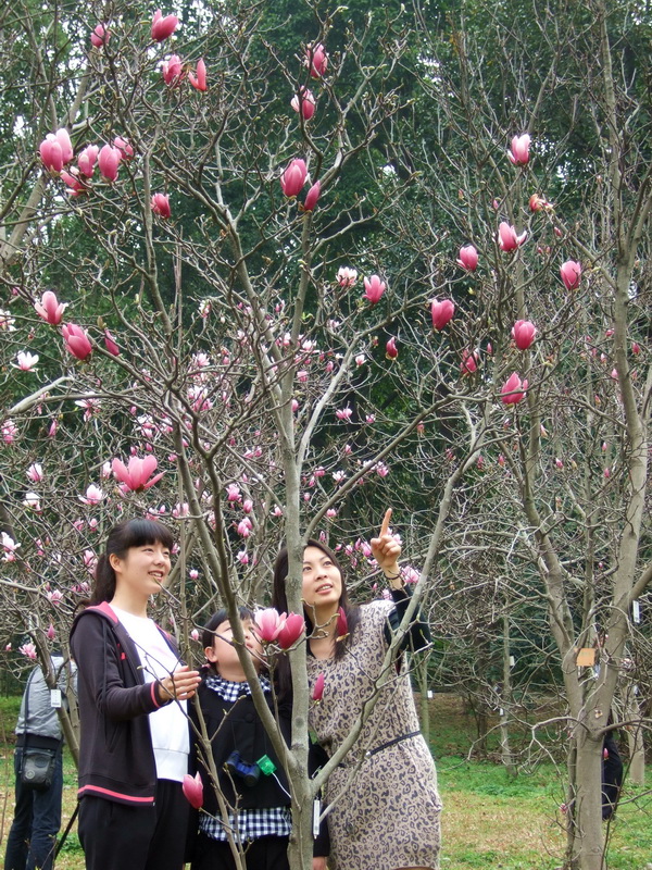 玉兰属植物是木兰科落叶乔木或灌木,其树形优美,花大艳丽,高贵典雅,芬芳袭人,有紫、深红、桃红、粉红、黄、奶黄、纯白、乳白等众多花色,深受国内外园林爱好者的青睐,作为珍贵的传统观赏花木,在园林应用中经久不衰。现木兰园里的玉兰、玉灯玉兰、望春玉兰、黄山玉兰、鹤山玉兰、二乔玉兰、红运二乔玉兰、阔瓣二乔玉兰、丹馨二乔玉兰和硃砂二乔玉兰等栽培种都在开花。花先于叶开放,满树含苞待放的花蕾,经一夜春风吹拂,花儿一下就竞相开放了,成了初春最早开放的花儿。