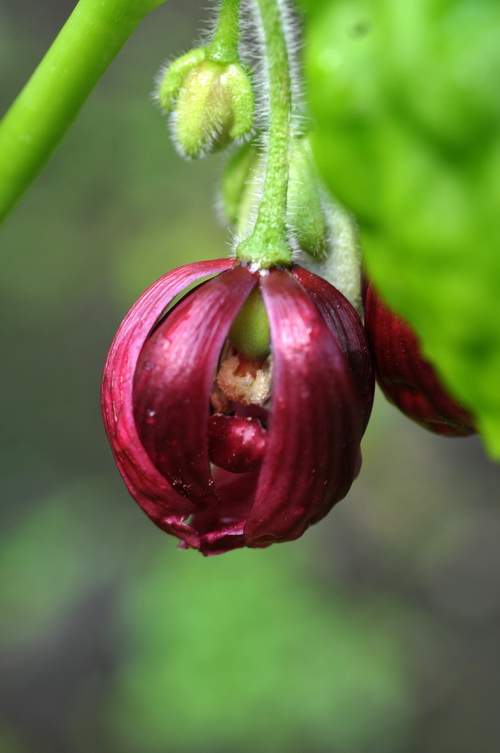 八角莲为小蘗科八角莲属多年生草本,分布于中亚热带至南亚热带广大地区,喜温暖潮湿的气候,常常野生于有泉水或伴有流水的林缘、山边。淡绿色的茎直立,横生的根茎粗壮,具明显的碗状节。单株一片叶,有时两片,盾状着生,有人据此称之为“独叶一枝花”或“一把伞”。叶片圆形,边缘有或多或少的浅裂或深裂(“八角莲”的名号便源于此),边缘具针刺状锯齿。其花苞着生在两个叶柄交叉处或独叶柄基处的上方,常常是数朵簇生,花苞下垂,开出紫红色花朵,宛若一个个小灯笼,虽不艳丽,倒也秀美,很耐看。
