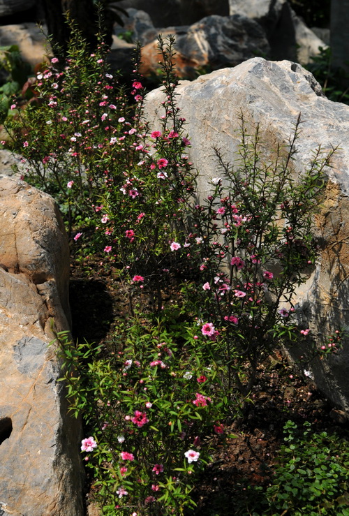松红梅(Leptospermum scoparium)是近年来新引进的花卉品种之一,原产新西兰、澳大利亚等地区。因其叶似松叶、花似红梅而得名,又因其重瓣花朵形似牡丹,故也称:“松叶牡丹”。其花朵虽然不大,但花色艳丽、花形精美,盛开时满树的小花星星点点、明媚娇艳,吸引着人们的目光。