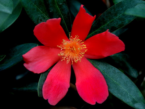 杜鹃红山茶(Camellia azalea )属于山茶科山茶属植物常绿小乔木,其叶片浓绿色,狭长倒卵形,边缘和叶面光滑,厚而有革质;花朵顶生或腋生,花瓣肉质较厚、呈长条状、鲜红色、花药金黄色、单瓣。杜鹃红山茶是一个奇异特殊的山茶原种,比普通的山茶花具有更多的特殊性。首先是叶片,我们一般看到的茶花,叶片边缘大都有明显的锯齿,而杜鹃红山茶的叶片边缘是全缘的,没有锯齿,十分光滑,形状、密度与杜鹃花十分相似,因此便有了“杜鹃红山茶”的名字。其次是花期,通常茶花的开花期从10月到来年4月,花期长达半年,没有在夏天开花的茶花,而杜鹃红山茶的盛花期在6月到11月,即使在炎热的夏季,依然满树红花,十分娇艳,如果栽培得好,一年四季都可以开花,因此也有“四季茶花”的别称。再次是抗逆性强,茶花常常被人们说成是怕冷、怕热、怕病虫害的娇气的花卉。可是杜鹃红山茶是抗逆性较强,它不仅在夏天开花,而且能忍耐-5℃,在长江以北的部分地区能露天栽培。因此杜鹃红山茶是一种很值得鼎力推广的园林绿化树种。