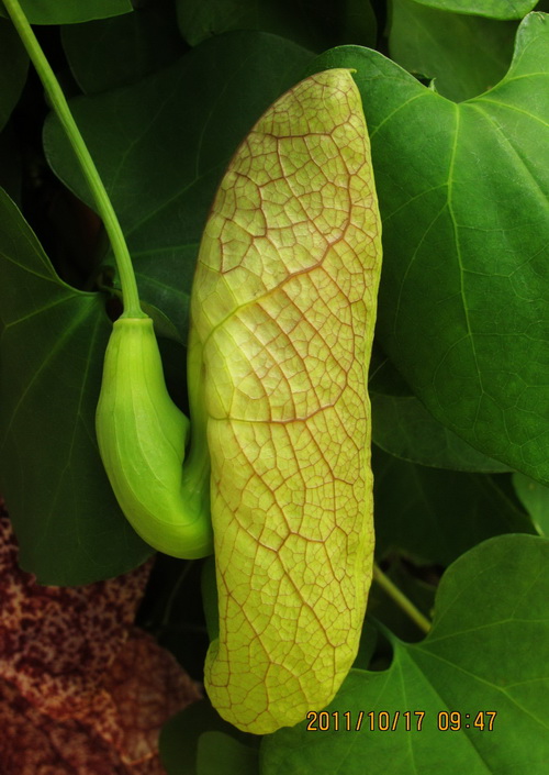 盛开的巨花马兜铃,其花型巨大,椭圆心形,花被褶折,紫红色、白色的斑纹交错,看起来色彩艳丽而又略显神秘,这些显著的特征,令其让人过目不忘。