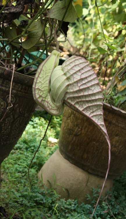 面对大花马兜铃(Aristolochia grandiflora Sw.)那美丽而奇异的花朵时,你会再次感受到大自然的神奇魅力:巨大的花朵仅由一片花瓣构成,花朵基部膨大的花囊,如同鹈鹕鸟嘴下面那个让人一眼就能认出的大皮囊,无怪乎人们又将之称为“鹈鹕花”。其花瓣下部逐渐收缩成一绸带状长尾,似是将囊中所藏之物源源倾泻而出。鹈鹕花花奇色艳,但最好远观而勿近闻,因为它的花朵会释放出一种死老鼠的恶臭气味,让人感到不适。如此奇异的花朵为何会有这般难闻的气味呢?究其原因,在于它奇特的花结构和植物特性:鹈鹕花虽是雌雄同株,但雌蕊先于雄蕊一天成熟,且它奇特的花结构使得雌雄蕊很难与传粉媒介接触,因此,为了吸引昆虫的造访,它释放出这种令人难闻却会吸引诸如蝴蝶之类的昆虫造访的气味,将昆虫吸引进入花囊中,待花枯萎后,再将已沾满花粉的昆虫释放出去,进入另一朵花,将花粉传到柱头上,从而达到授粉的目的。