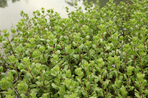 异叶水蓑衣生于水边,植株丛生,族丛密致、齐整,常在湖泊、水塘的岸边浅水区域成片分布,形成整齐划一的翠绿生态小景观。它的挺水叶羽状,对生,浅蓝色的小花单生于叶腋,星星点点与绿叶相互映衬,生机盎然。