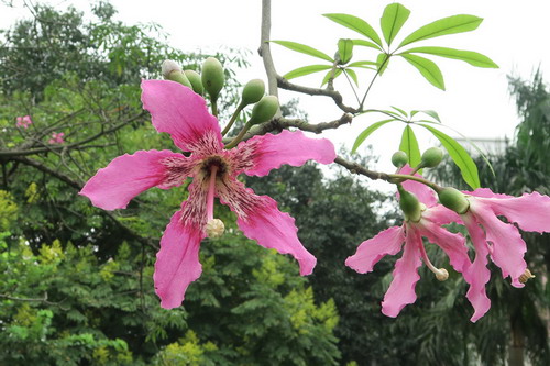 美丽异木棉(Ceiba speciosa (A.St. –Hil.) Ravenna),木棉科。落叶大乔木。树干下部膨大,密生圆锥状皮刺。掌状复叶有小叶5—9片。花冠淡紫红色,中心白色;花瓣5枚,卵形,略反卷;花丝合生成雄蕊管。花期8—10月。美丽异木棉花谢后结果,果实有的大的像柚子,一个个如炮弹般倒挂在光秃秃的枝杈上,甚为壮观。果实成熟后,厚厚的外皮自然脱落,一团白色的絮状物脱颖而出,洁白炫目,悬挂在枝头,状如成熟开裂的棉花团,这些絮状物柔软性、保暖性还胜过真正的棉花,用它还可以填充枕头。美丽异木棉原产南美洲,现在广植于广东、云南、海南、广西、福建等省区。