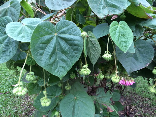 非洲芙蓉(Dombeya wallichii (lindl.) Baill.),梧桐科(Sterculiaceae)常绿大型灌木,叶片心形,较粗糙。开花时,长长的花轴上抽出等长的小花梗,粉红色至淡红色的小花20余朵,悬吊而下,钟形,组成漂亮的悬垂花球。