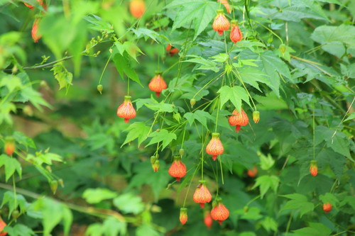 现在正在盛放的纹瓣悬铃花,还有好听的名字——金铃花、风铃花。锦葵科(Malvaceae)常绿灌木。叶掌状3~5深裂。其花腋生,花柄长而细,花冠橙红色,具红色纹脉,瓣端向内弯,似钟形显得美丽而可爱。一朵朵半展开状的花朵挂在柔软的枝条上,如同迎风摇曳的铃铛,倍受人们喜爱。