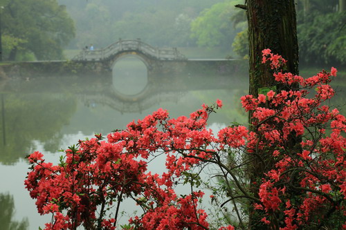 杜鹃盛花时节,花朵密密匝匝,竟相辉映,蔚为壮观,有“木本花卉之王”的美誉,因花开时映得满山皆红而得名。“映山红”是“杜鹃啼血,子归哀鸣”典故的出处。【唐】李白诗云:“蜀国曾闻子规鸟,宣城还见杜鹃花;一叫一回肠一断,三春三月忆三巴”,咏颂杜鹃鸟与花终身不弃的爱恋。【唐】白居易赞杜鹃花:“花中此物似西施,芙蓉芍药皆嫫母;回看桃李都无色,映得芙蓉不是花”,故得“花中西施”之美誉。【宋】杨万里诗云:“何须名苑看春风,一路山花不负侬。日日锦江呈锦样,清溪倒照映山红。”