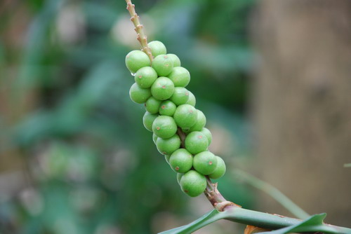 益智(Alpinia oxyphylla Miq.),又名益智仁,为姜科(Zingiberaceae)多年生草本。高1~3m;茎丛生。叶片披针形,顶端渐尖,基部近圆形。总状花序在花蕾时全部包藏于酷似“高帽”状的总苞片中,花时渐脱落;花冠白色,唇瓣中部具粉红色脉纹。微风吹拂,就像是带着“高帽”的“美少女”在翩翩起舞。蒴果圆球形,浅黄绿色。花期3-5月。果期4-9月。