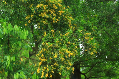 相思树,一个十分浪漫的名字,是否会让你想到那红色的相思豆——恋人的爱情信物呢?可惜的是,美丽的相思豆并非相思树所生。王维的“红豆生南国,春来发几枝,愿君多采集,此物最相思”中的红豆,是一种蝶形花科红豆树(Ormosia hosiei)的种子。而另一种常用做手链的红色带黑点的“红豆”,是蝶形花科相思子(Abrus precatorius)的种子,有剧毒。而相思树并不会结出红色的种子,只会结出咖啡色的扁扁的小不点儿种子,并不好看,其貌不扬。但相思树的花非常美丽,满树金黄,一簇簇“毛茸茸”的小花甚是可爱。