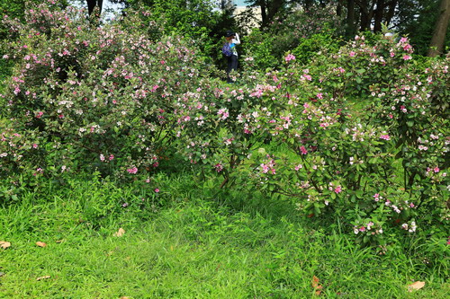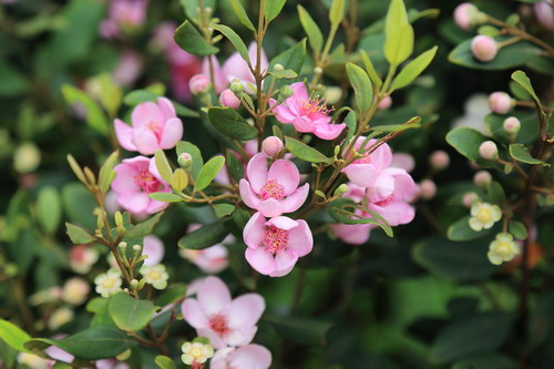 除了果实香醇浓甜外,稔子树的花也甚是好看,五六月间,是稔子开花的季节,那花粉白嫩红,聚拢一堆,样子与桃花很相似,但较之桃花,却少了几分妖娆,多了几分质朴,花并不是很娇艳,但那漫山遍野的一片粉红色,实在令人心醉。稔子的花,花瓣多为五六瓣,中间围着几枚黄色的花蕊,花朵先红后白,红白相间,清丽秀美,边开花边结果,果实一开始是青色的,很小的一个,会慢慢随着成熟就变大,这首童谣便形象地唱出了果子的变化过程:七月半,稔子乌一半,八月中秋,稔子乌溜溜!九月九,稔子甜过酒;十月朝,稔子做柴烧!