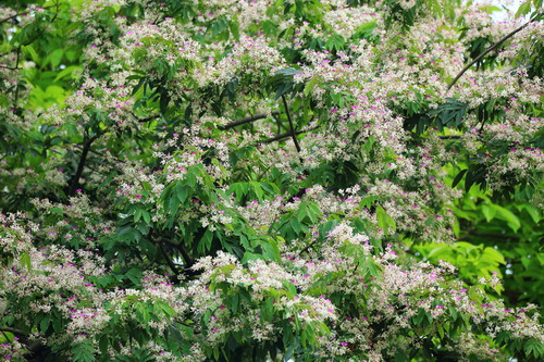 短萼仪花是优美的乡土园林景观树种,具典型的“变色花”特性,花未开时,花托呈嫩绿色,初开时花瓣为白色,盛开时变成紫色,可谓花色多变。花开时节,整个树冠绿色、白色、紫色共存,繁花朵朵,非常美丽。花期4-5月;果期8-9月。