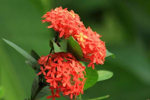 龙船花(Ixora chinensis Lam.),又名仙丹花、水绣球,茜草科(Rubiaceae)常绿小灌木。叶倒卵形至矩圆状披针形,新叶红色。聚伞花序顶生,花序具短梗,有红色分枝;花冠裂片4,花色以红色最为常见,还有白、黄、橙等色。花期5-12月。