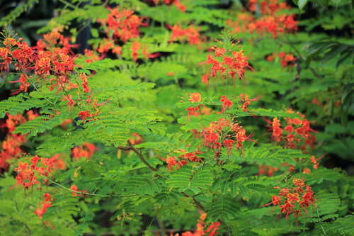 炎炎夏日,艳阳高照,路上行人都把自己武装得严严实实,或打遮阳伞或带遮阳帽。在华南植物园里,绿树成荫,游人三五成群,或亲朋或好友相约在一起,享受这大自然赐予的清凉。在华南植物园的生物园里,洋金凤不惧酷暑花开得正艳,树形轻盈婀娜,优美动人。在阳光的照射下,鲜红色或橙黄色的花儿交相辉映,像传说中的火凤凰在林间飞舞,尽情绽放自己。