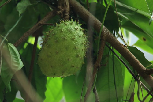 刺果番荔枝(Annona muricata Linn.),又名红毛榴莲, 番荔枝科(Annonaceae)常绿乔木,高可达8米。树皮粗糙。叶纸质,倒卵状长圆形至椭圆形,叶面翠绿色而有光泽,叶背浅绿色。花蕾卵圆形,花淡黄色,外轮花瓣厚,阔三角形,内轮花瓣稍薄,卵状椭圆形。果实卵圆状,深绿色,幼时有下弯的刺,刺随后逐渐脱落而残存有小突体。果实硕大,白色果肉有酸甜味,多汁,可食用;含蛋白质0.70%,脂肪0.40%,糖类17.10%,可谓营养丰富。种子多颗,肾形,棕黄色。花期每年4—7月,果期7月—翌年3月。