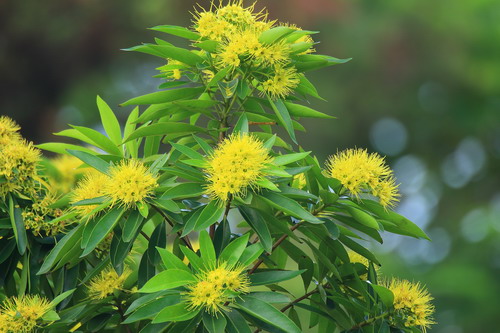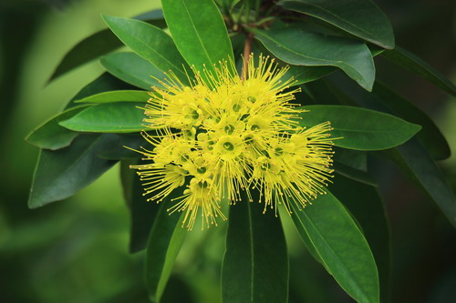 金蒲桃(Xanthostemon chrysanthus (F. Muell.) Benth.),别名黄金熊猫、黄金蒲桃,澳大利亚特有植物。桃金娘科(Myrtaceae)常绿小乔木,叶对生、互生或丛生枝顶,披针形,全缘,革质,叶表光滑,搓揉后有番石榴气味,新叶带有红色。花序呈球状,初开时黄绿色,随后转为黄色,近凋谢时为金黄色。虽说是花,其实其花瓣已退化,只有明显的圆形萼片和花蕊,雌雄蕊长长伸出,丝丝放射,格外别致。全年有花,盛花期为11月到次年2月,果为蒴果。