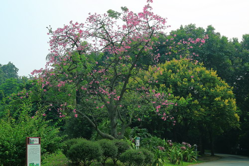 这几日的广州,虽烈日当空,但空气中已弥漫着丝丝秋意。当您走进华南植物园木本花卉区便会发现一棵高大的树上开满艳丽的花朵,乍一看,很容易让人以为是木棉树。本应在春季开花的木棉树,居然在秋天开花了?原来这是与木棉花同科不同属的美丽异木棉。两者都是木棉科落叶大乔木,不同的是美丽异木棉花期为秋冬季。美丽异木棉开花时满树鲜艳的花朵,绚丽耀目,异常美丽,故也被称为“美人树”。
