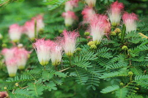 一看到这种花,就会被它粉粉的、软软的、毛绒绒的可爱模样所吸引,忍不住想用手碰碰, 这种花叫苏里南朱缨花(Calliandra surinamensis Benth.),又名长蕊合欢、粉扑花,为豆科(Leguminosae)落叶灌木或小乔木。枝条开展,树形优美,如反撑的伞。叶如羽片,每当夜幕降临,叶片会害羞地闭合起来,次日早晨再展开,早睡早起,如人类作息般,这种行为被称为睡眠运动。头状花序状如红缨,花丝极多,细长,基部白色,上端粉红色,聚合成半球状,像极了姑娘化妆用的粉扑,故名粉扑花。花期4-10月。