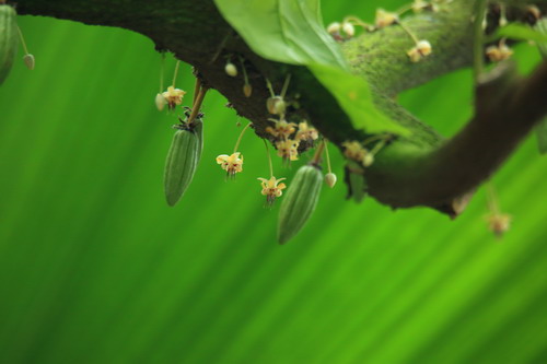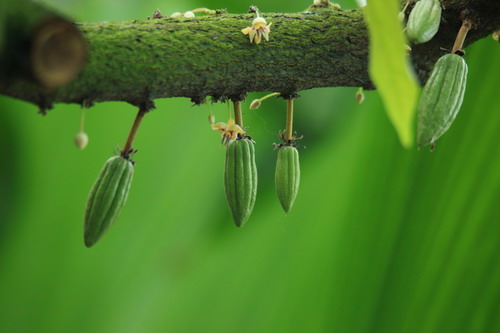可可(Theobroma cacao L.),梧桐科(Sterculiaceae)常绿乔木,生长于潮湿的热带雨林低地里,尤其喜欢待在高大树荫下。树高达15米,树冠繁茂,叶长可达20-30厘米,长椭圆形。她是典型的老茎开花结果,花簇生于树干或主枝条,白色,精致细小,主花期为5-11月,熟果期4-5月、9-11月。植后4~5年开始结实,每年每株产豆荚60-70枚。果实长椭圆形、纺锤形,外皮具纵沟,较厚,酷似橄榄球,初为浅绿色,成熟后变为橙黄、褐红色;内有种子(可可豆)30-50粒,埋藏在胶质果肉中,卵形或椭圆形;可可豆含40-50%的可可脂,经过发酵及烘焙后可制成可可粉。
