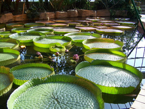 王莲是睡莲科(Nymphaeaceae)王莲属(Victoria)的著名水上观赏植物,包括原产于南美巴西的亚马逊王莲(Victoria amazonica)和原产于巴拉那河流域的克鲁兹王莲(Victoria cruziana)两个原生种,及两者的杂交种长木王莲(Victoria ‘Longwood’)。在原产地是多年生的水生植物。王莲作为典型的热带植物,喜高温高湿,耐寒力极差,气温下降到20℃时,生长停滞;气温下降到14℃左右时有冷害,气温下降到8℃左右,受寒死亡。因此在华南地区较暖的年份,王莲可在露地栽培,不能在露地越冬。在广州,王莲一直是作为一年生的水生植物,一般10月份气温下降后,露地栽培的王莲会出现生长萎缩、不开花的现象,随着温度的下降,则完全退冬。为了保证王莲能在广州顺利越冬,从2009年开始,华南植物园经过3年的试验,在热带雨林温室内的池塘里通过一系列的加温、补光措施,攻克了克鲁兹王莲的冬季栽培技术,保证了植株的多年生生长。现在,在热带雨林室内基本上能全年欣赏到王莲开花的景观。