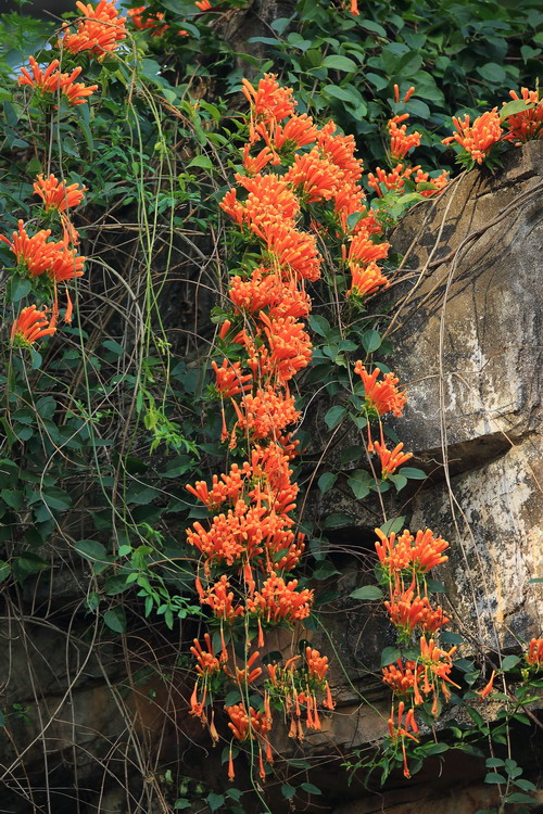 “爆竹一声除旧岁”,春节放鞭炮作为传统习俗,历史悠久,为节日增添了欢乐的气氛。如今,由于燃放烟花爆竹造成环境污染、火灾及人员伤亡等,不少城市都已禁止在公共场所燃放,这一传统习俗也就慢慢淡出人们的视野。虽然不能放鞭炮了,可南方的市民,在春节前后能欣赏到如串串鞭炮一样喜庆的炮仗花。那一串串橙红色的花朵从1月份开始绽放,一直开到4月份,串串即将燃爆的“鞭炮”垂挂枝头,数量极多,非常壮观,为春节带来浓郁的节日喜庆气氛。华南植物园的炮仗花在春节前开始开花,现已进入盛花期。