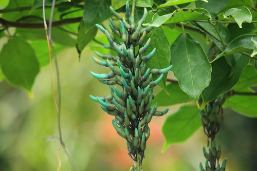 翡翠葛(Strongylodon macrobotrys A. Gray)又名碧玉藤,蝶形花科碧玉藤属木质藤本,来自菲律宾。其花朵沿着花梗呈平展状生长,每一串花有数十朵,每一朵盛开的花像是一只翡翠雕琢而成的小鸟。花碧玉色透蓝色光泽,花友们称其为绿松石色。在阳光的照耀下,如翡翠般晶莹剔透,含苞的酷似翡翠象牙,盛开的如同翡翠雕琢而成的金刚鹦鹉的喙,弯弯上翘的龙骨瓣甚为张扬。