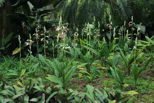 鹤顶兰属(Phaius Lour.)于1790年创立,其拉丁名Phaius的意思是深颜色的花朵,但其实鹤顶兰属的花朵也不乏鲜艳的颜色。鹤顶兰属约有50种,我国有8种,全部可供观赏。鹤顶兰的栽培历史已有200多年,1778年欧洲人从中国引入第一株鹤顶兰后,在西方就开始了对鹤顶兰连续不断地研究和培育。目前市场上的鹤顶兰栽培品种已经十分丰富,加上它花期长,有香气,早已成为人们喜爱的盆栽花卉。除鹤顶兰外,我园还栽培有黄花鹤顶兰(Phaius flavus,叶具黄色斑点,花淡黄色,不完全开放,唇瓣具3-4条褐色条纹)、仙笔鹤顶兰、紫花鹤顶兰等。