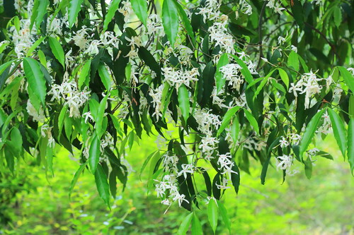 花开时灿烂,繁花满树,万千白蝶舞枝头;花落时凄美,边开边落,洋洋洒洒铺满地。捡起地上的落花仔细端详,洁白的花瓣中间一点红色,令人顿生怜惜之情,这就是蕊木开花时节的情景,边开边落,充满诗意。
