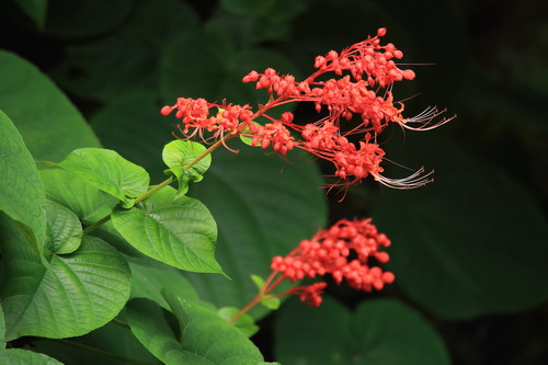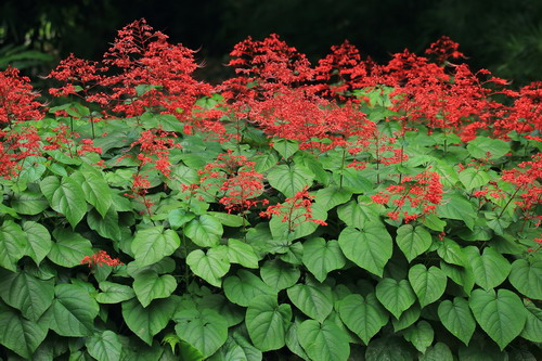 状元红(Clerodendrum japonicum (Tunb.) Sweet)又名赪桐、百日红,是马鞭草科(Verbenaceae)落叶灌木,株高1-2米。深绿色的叶子对生,呈大大的心形,纸质,触之有臭气。花红色,具有芳香,为总状圆锥花序,顶生,向一侧偏斜;花萼细小,漏斗形;花冠红色,雄蕊长长地伸出花冠外,并且向上卷翘。花梗、花萼、花冠、花药、花丝均为鲜艳的深红色,着生花朵的茎秆也是红色,在绿叶的衬托下绚丽而娇艳,美不胜收。果实椭圆状球形,蓝紫色。花果期5-12月。