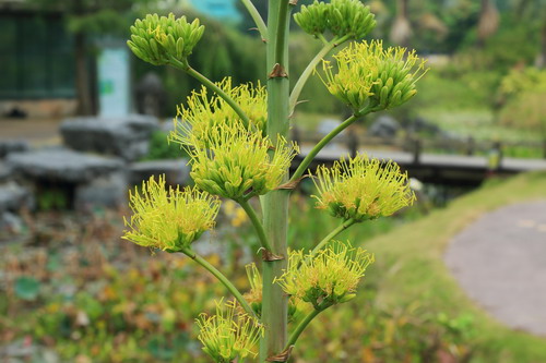 开花时粗壮的花葶从莲座状叶的中心抽出,像雨后春笋突然冒出来,刚劲挺拔,剑指蓝天,生长迅速,花葶高可达23米;一团团花从花葶下端往上开,浅黄色,多达数百朵,颇有气势。虽然花葶的生长迅速,但前期孕育开花的过程漫长,花芽从花茎上抽出到开花要一个多月的时间。而整个植株种植20年左右才开花,花期持续1年半左右,然后植株慢慢死亡。