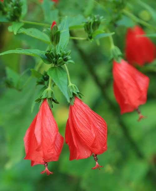 垂花悬铃花(Malvaviscus penduliflorus Candolle),锦葵科(Malvaceae)常绿灌木,高可达2米。叶卵形至近圆形,全缘或浅裂。花单生于叶腋,花枝下垂;花冠漏斗形,仅上部略微展开,鲜红色。在热带地区,几乎全年开花,盛花期在9-12月。