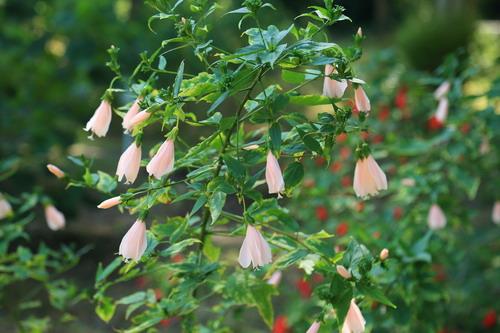 粉花悬铃花(Malvaviscus arboreus var. mexicanus)也处于花期。观赏地点:生物园