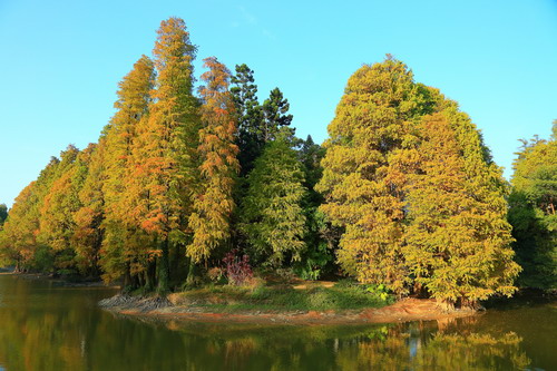 水生植物园两岸的落羽杉最年轻,为前几年所种,还比较纤细,气生根也不发达,现在已有不少变成红叶,穿梭于林中,看漫天飞舞的红叶,别有一番韵味。
