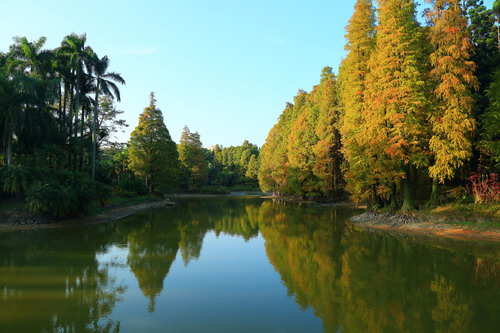 落羽杉(Taxodium distichum)喜欢生长在水边,华南植物园内有多处观赏落羽杉红叶的景点。如今,各个景点的树叶变色程度不同,最快的已基本全部变红,最慢的才刚刚开始变色,绿叶、黄叶共存。