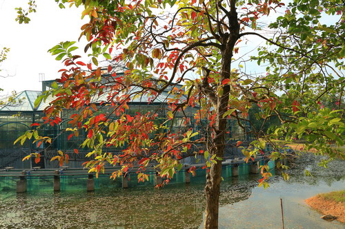 另外,除了落羽杉红叶,园内还有其它变叶树种。其中枫香(Liquidambar formosana)和大叶紫薇(Lagerstroemia speciosa)的树叶已变红。