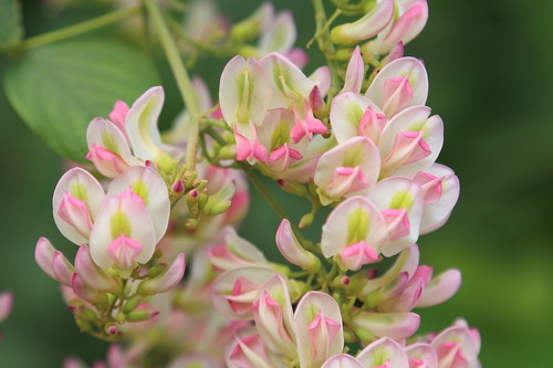 须弥葛(Pueraria wallichii DC.),豆科大型灌木状缠绕藤本植物。由于茎节落地生根,有独藤成林的特点。花期11月底至第二年1月,总状花序于枝条未端每节上抽生,可连抽七八穗之多,加之枝条柔软,花随风舞,引起阵阵花浪。小花花冠清秀,白里透红,有如含羞之少女。