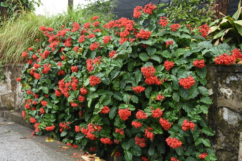 远远地看,艳赪桐的花开成一团团红色,如火焰、如祥云,点缀在绿墙上。走近了细细地赏,它的叶片椭圆形,成对地着生在枝条两侧,边缘微微波皱着,聚伞花序顶生,每个花序上,挨挨挤挤地排着十几朵至几十朵红色的花朵。这种红,是正正的中国红,不光花瓣是红色,连花萼、花蕊和花蕊上的花药都是红色的。5枚花瓣向四周舒展开来,雄蕊和雌蕊仿佛从中央喷射而出,略带些弯卷。你看着看着,眼前似是红红的火焰,又似有几只、十几只甚至几十只红火的蝴蝶开始振动翅膀,欲从火焰中飞将而出……