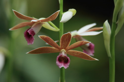 鹤顶兰属(Phaius Lour.)于1790年创立,其拉丁名Phaius的意思是深颜色的花朵,但其实鹤顶兰属的花朵也不乏鲜艳的颜色。鹤顶兰属约有50种,我国有8种,全部可供观赏。鹤顶兰的栽培历史已有200多年,1778年欧洲人从中国引入第一株鹤顶兰后,在西方就开始了对鹤顶兰连续不断地研究和培育。目前市场上的鹤顶兰栽培品种已经十分丰富,加上它花期长,有香气,早已成为人们喜爱的盆栽花卉。除鹤顶兰外,我园还栽培有黄花鹤顶兰(Phaius flavus),叶具黄色斑点,花淡黄色,不完全开放,唇瓣具3-4条褐色条纹)、仙笔鹤顶兰、紫花鹤顶兰等。