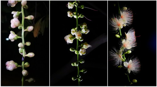 梭果玉蕊为两性花,有一枚雌蕊和多数雄蕊,长长地伸出花冠之外,花蕊洁白如玉,基部与顶端粉色,花似一个个粉妆玉琢的绒球;其穗状花序生于小枝顶端或老枝上,可长1米,上面着生花苞似串串珠帘;花苞次第开放,虬曲在花苞中的花蕊渐次挣扎而出、由盘曲至慢慢伸直、似迸丝溅玉,煞是好看。