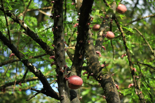 叉叶木不但花奇,果也非常有趣。花掉落以后,剩下2裂达基部的花萼和长长的花柱,整个画面神似挖耳勺七七八八竖在树干上,憨态可掬,让人忍俊不禁。淡黄色子房发育成果实,圆圆的蒴果直接挂在粗壮的树干上,常常三五成群排排坐,小西瓜大小的果实,干干净净的表面泛着汹涌的光泽,初生果实向光的一面还透出朝霞一般的淡粉红色,成熟时又变为紫红色,百转千回,煞是有趣。叉叶木观花期长,观果期更长,果壳可入药,是园林中极具价值的观赏树种。