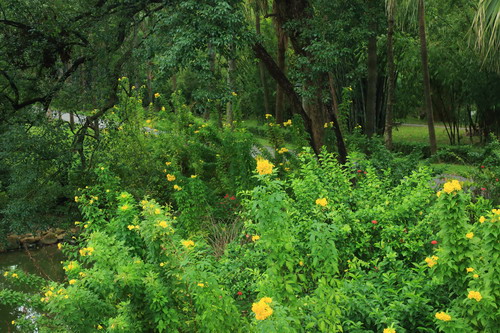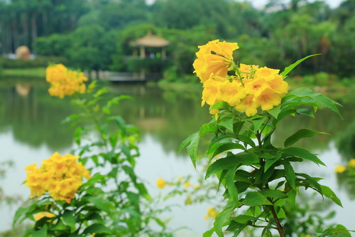 除黄钟花以外,在这美丽的华南植物园里,放眼望去,灌木的、开的不知疲惫的黄花比比皆是,荚果两个一组的双荚决明、荚果有翅的翅荚决明、花密集呈半球形的黄龙船花、花苞形似蝉蛹的黄蝉花等等,大有秋花更比春芳魅之势。这些花儿就好像邻居小孩,我们呼吸着同样的空气,看着它们从小到大,习以为常。忽然一个转身,被深深触动,在华南植物园彩虹桥边,秋晴的阳光下,黄钟花绿树黄花倒影在水中,鱼戏浅底,顿时一幅绵延的山水画从心中蔓延。秋光冉冉,岁月匆匆,风景无处不在,在感叹时光飞逝的同时,或许我们最该留意的是生活中凡常的美好。