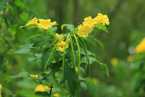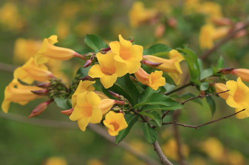黄钟花,紫葳科黄钟花属常绿灌木,对生奇数羽状复叶,花冠漏斗状钟形,基部收缩呈细管,花常数朵头挨着头、肩并着肩、手拉着手环成一个圈,远观宛如众多小喇叭组成的黄绣球。黄钟花拉丁名为Tecoma stans,其属名Tecoma源于墨西哥语tecomaxochit,指黄钟花,由此可见一斑,黄钟花是外来种,原产南美和西印度群岛;种加词stans意思是直立的,黄钟花的茎直立,非常有精气神,在普遍较为“慵懒”的灌木丛中独树一帜。