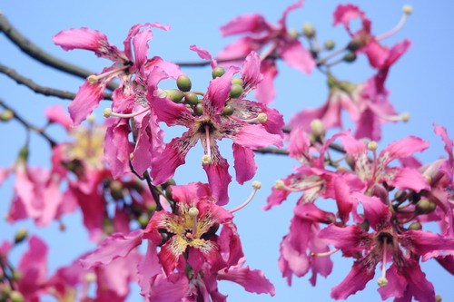 走进华南植物园木本花卉区,也会发现一棵高大的树上开满这种艳丽的花朵,她就是和广州市花木棉花同科的姐妹花——美丽异木棉。她两都是木棉科落叶大乔木,木棉的花期为春节,而美丽异木棉花期为秋冬季。美丽异木棉开花时满树鲜艳的花朵,绚丽耀目,异常美丽,故也被称为“美人树”。