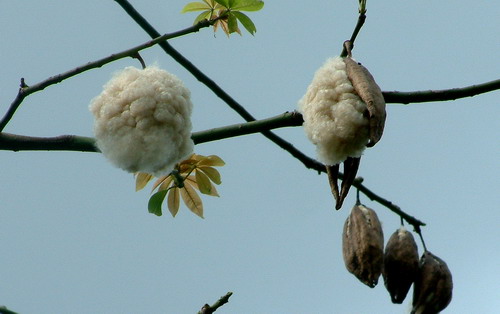 美丽异木棉花谢后结果,果实有的大的像柚子,一个个如炮弹般倒挂在光秃秃的枝杈上,甚为壮观。果实成熟后,厚厚的外皮自然脱落,一团白色的絮状物脱颖而出,洁白炫目,悬挂在枝头,状如成熟开裂的棉花团,这些絮状物柔软性、保暖性还胜过真正的棉花,用它还可以填充枕头。