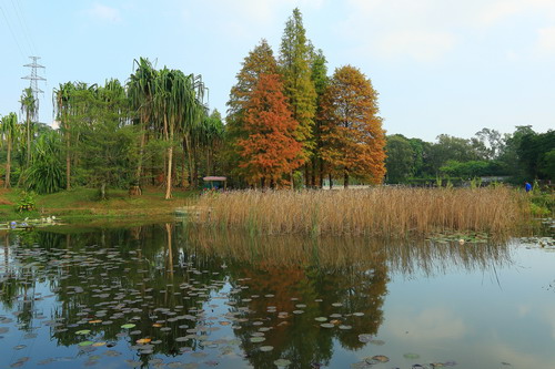 落羽杉、池杉、水松、水杉等都喜欢生长在水边,华南植物园水边有多处观赏红叶的景点——龙洞琪林(孑遗植物区、棕榈园)、水生植物园两岸及湖中心露兜园、科普信息中心前三拱桥边。各个景点的树叶变色程度不同,有的树已基本全部变红,最慢的才则刚刚开始变色。现如今,园内绿叶、黄叶、红叶共存,色彩丰富绚烂。