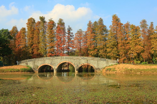 科普信息中心前三拱桥边的落羽杉,变色速度介于龙洞琪林和水生植物园两岸之间,现在颜色最为丰富,绿叶、黄叶、红叶共存,树丛倒影水中,层林尽染。