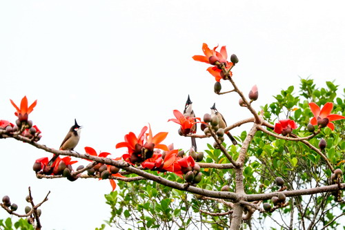 广州常见鸟类——红耳鹎在木棉花上觅食嬉闹