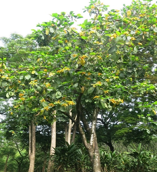 大黄栀子(Gardenia sootepensis)与栀子同科同属,亲缘关系很近。但是,栀子是小灌木,花初开时白色,一天后转为淡黄色。大黄栀子则为乔木,高7-10米,花单生于小枝顶端,开黄色花,高脚碟状,芳香;果绿色,椭圆形或长圆形。花期4-8月,在广州大黄栀子比栀子晚半个多月开花,果期7月至翌年4月。大黄栀子产云南澜沧、勐海、景洪、勐腊;生于海拔700-1600米处的山坡、村边或溪边林中。国外分布于泰国和老挝。