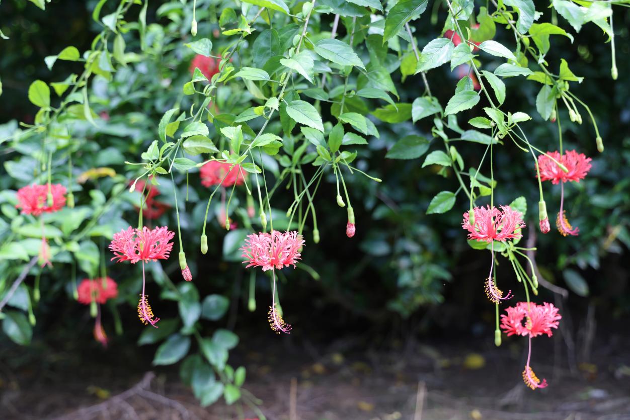 吊灯扶桑,又名灯笼花,花梗纤细下垂,花瓣深细裂呈流苏状向上反曲,雄蕊柱长而突出。