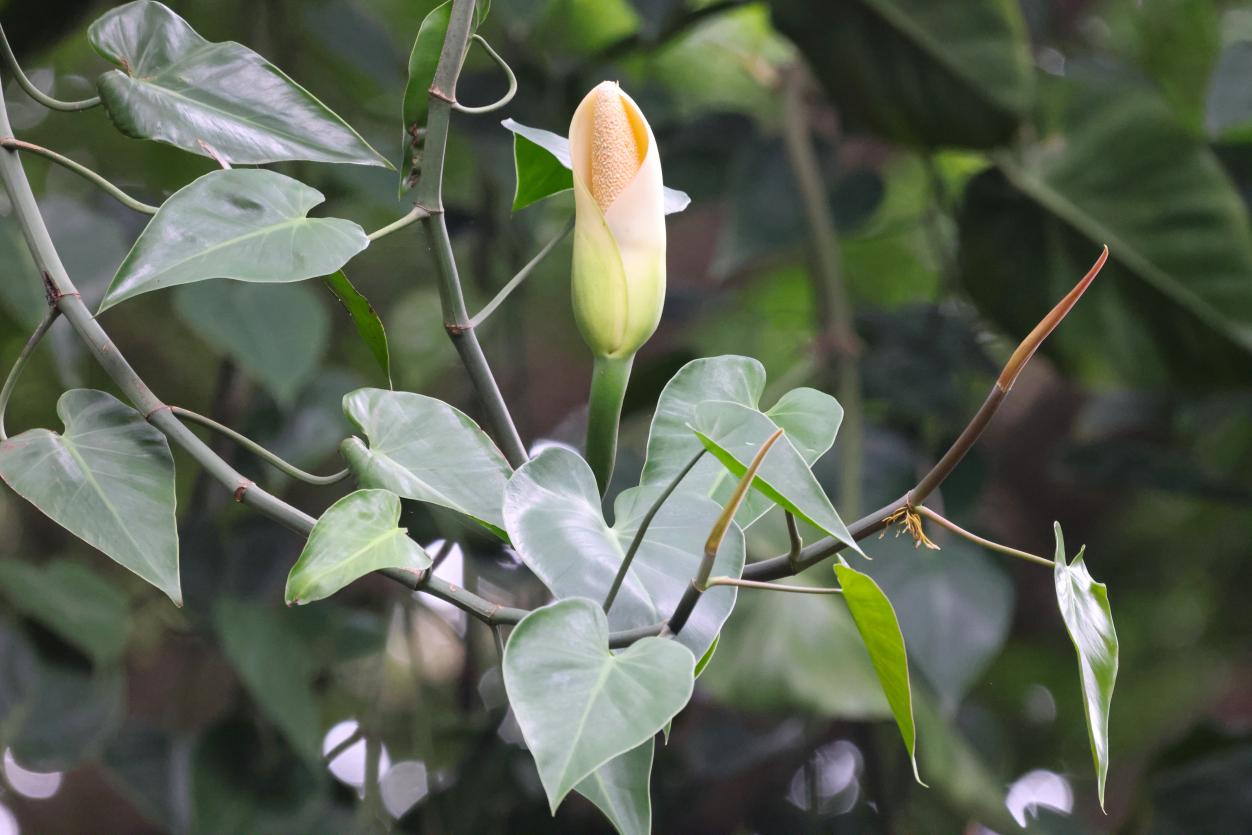 心叶蔓绿绒,叶子爱心形,藤蔓爬上高高的树枝,开出了白色的花。